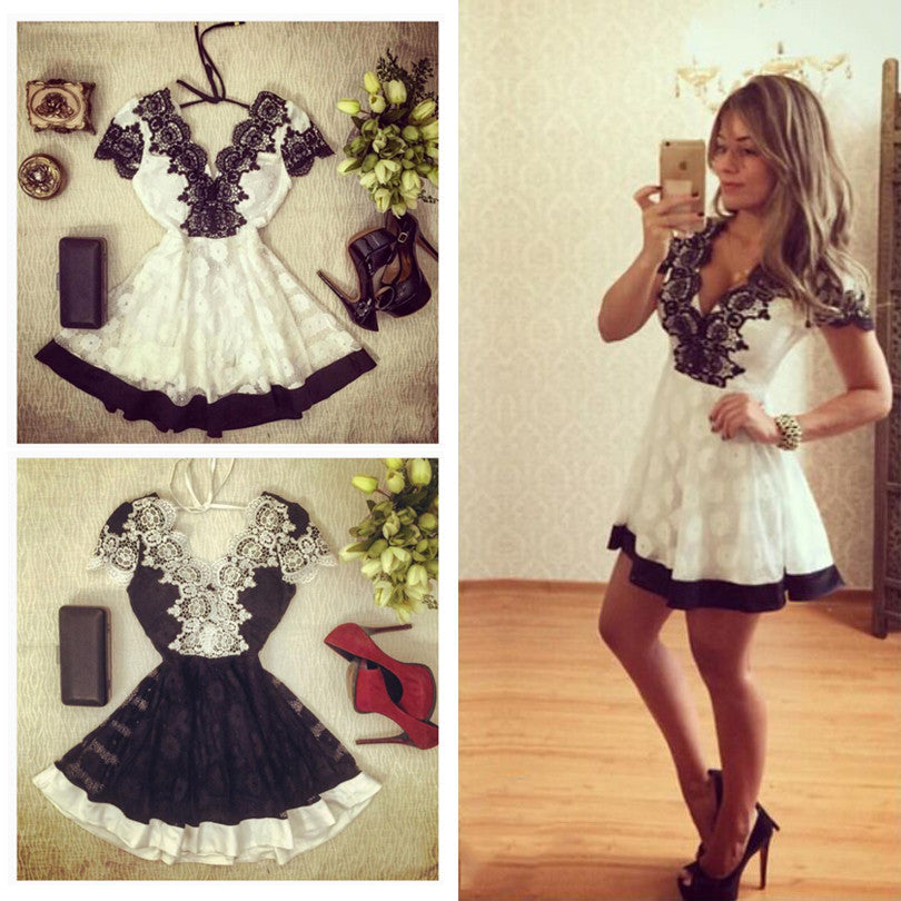 2016 nuove donne di modo lace mini abito bianco e nero con scollo a v manica corta abiti casual sexy vestito da a-line