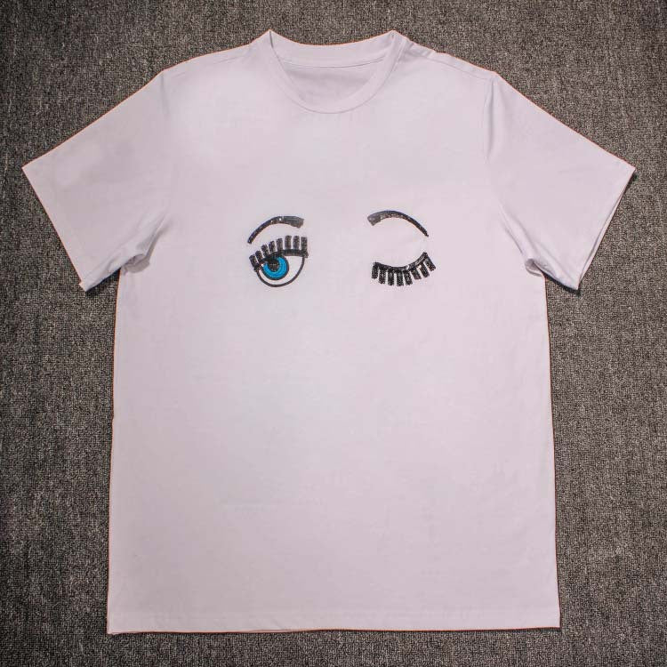 2016 New Fashion Summer Cotton Women T Shirts Chiara Ferragni Big Eyes Embroidery Sequins Loose Style T Shirts Women Casual Tops.....