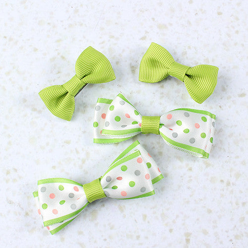 2 paired bow set with mid-sized polka-dot bow accompanied with 2 petite solid colored bows. One size fits all.