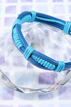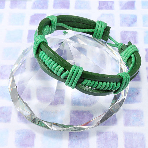 Colored leather bracelet with wrapped cord going through and over . This bracelet makes a cute accessory for layering! One size fits all.